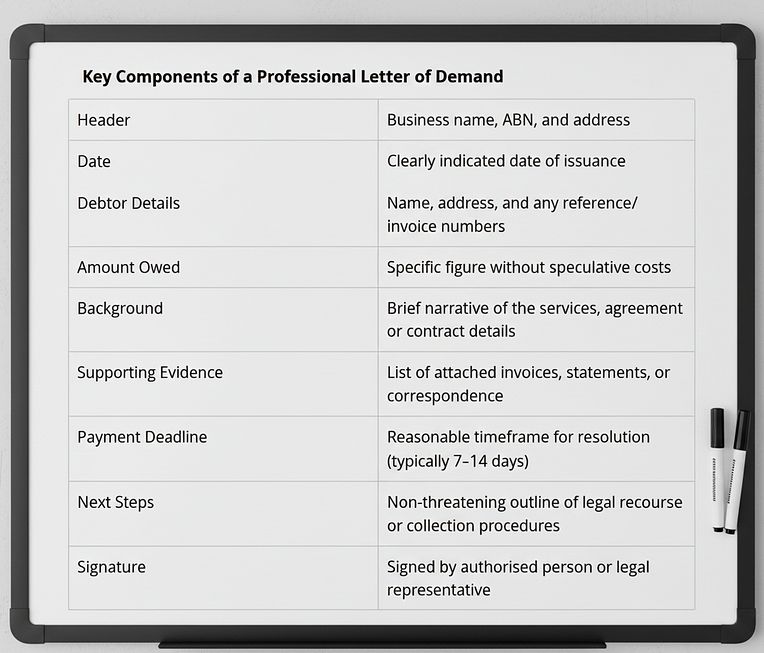 Every professional demand letter must contain key elements, including the debtor’s full legal name, address, invoice number, exact outstanding amount, the original due date, and a clear payment timeframe — typically 7 to 14 days. Supporting attachments such as invoices, signed agreements, or proof of completed services strengthen your claim and help avoid disputes.